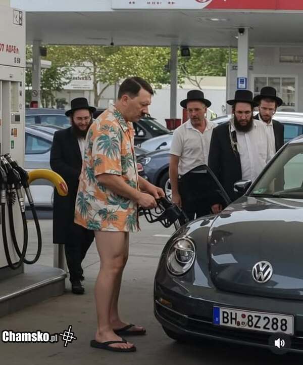 Widać, że to AI. Prawdziwy miałby samochód na gaz.